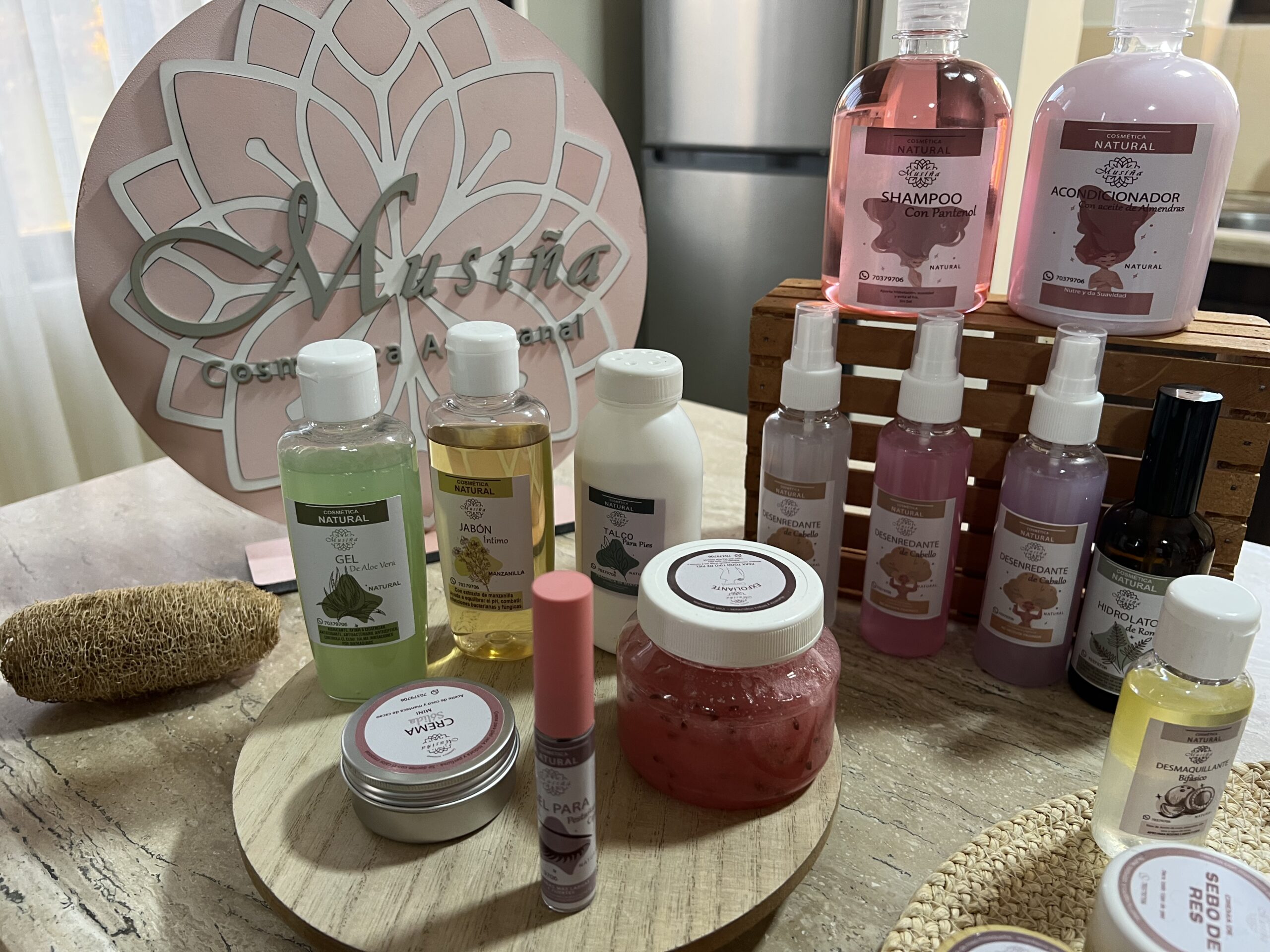 Hoy Andrea se dedica de lleno a su marca Musiña Cosmética Artesanal, que cuenta con alrededor de 25 productos entre faciales, capilares y corporales. La línea incluye desde jabones, tónicos y sérums, hasta shampoo, desenredantes, perfumes sólidos, bálsamos labiales y gel para pestañas. Con el tiempo, se ha capacitado con cursos y lecturas para perfeccionar sus fórmulas y ofrecer productos seguros, efectivos y con una identidad propia.